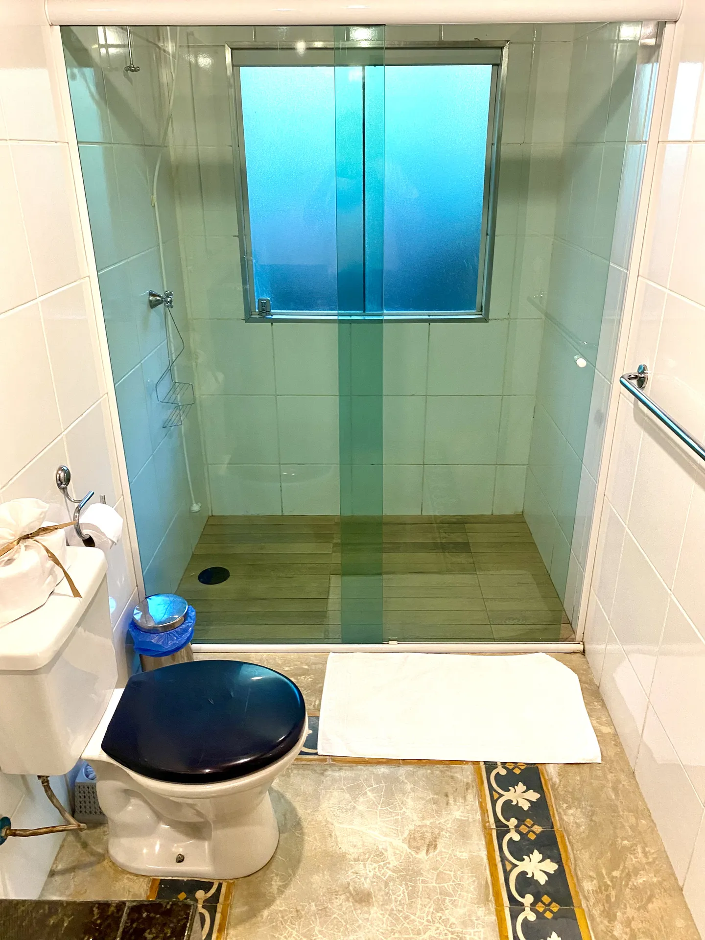 Na sala, quatro colchões encapados em courino preto funcionam como sofá estilo tatâmi, podendo também ser usados como camas extras, aumentando a capacidade de acomodação para até oito pessoas. Piso laminado, geladeira e micro-ondas complementam a estrutura, oferecendo praticidade durante a estadia.