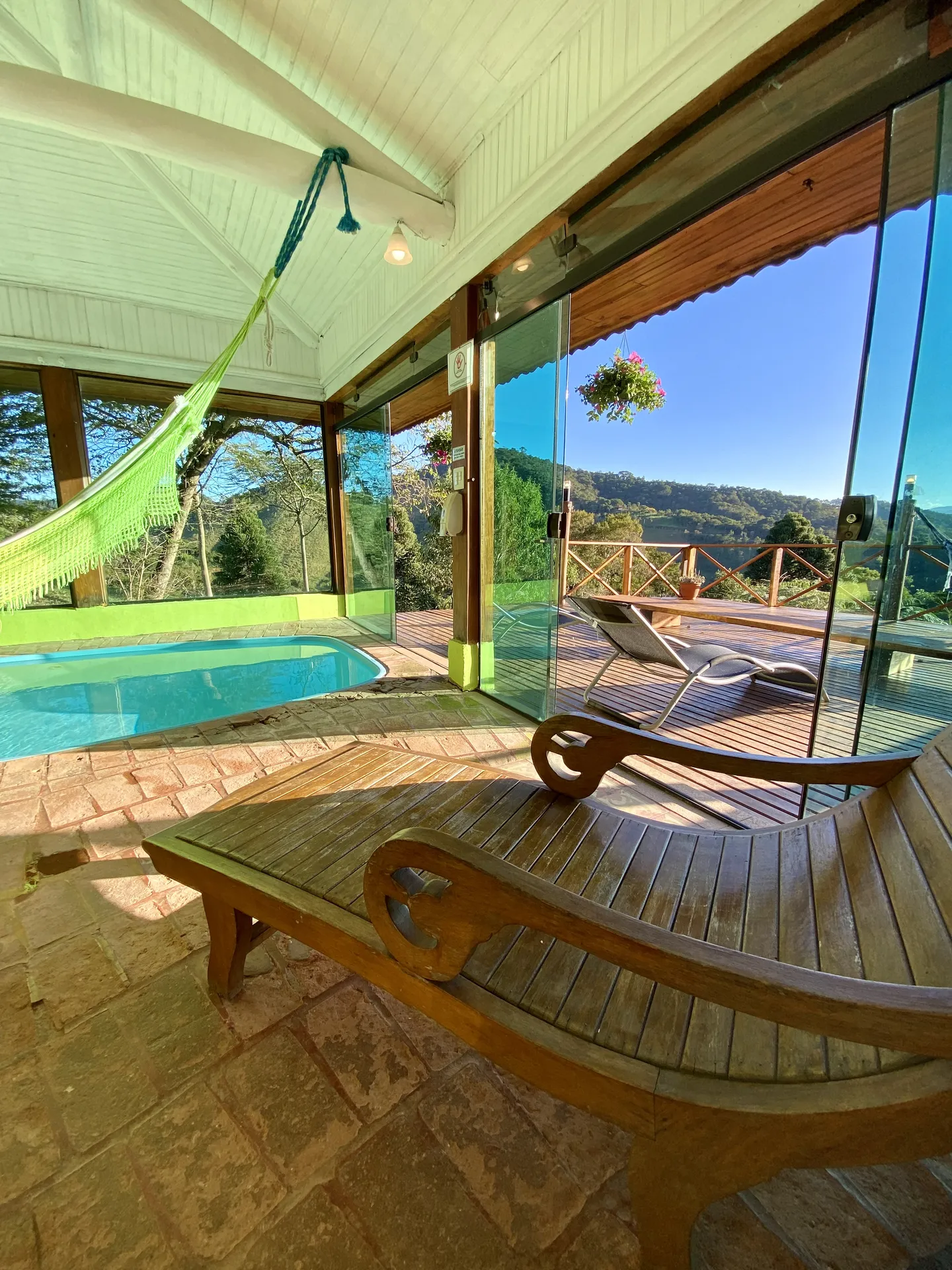 A piscina interna aquecida é o destaque principal, proporcionando momentos de relaxamento em qualquer época do ano. Ao redor da piscina, espreguiçadeiras convidam ao descanso, enquanto uma lareira aconchegante garante um clima acolhedor, mesmo nas noites mais frias. A área também conta com uma mesa para refeições e uma rede de descanso para momentos de pura tranquilidade.