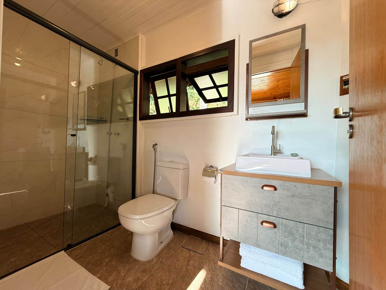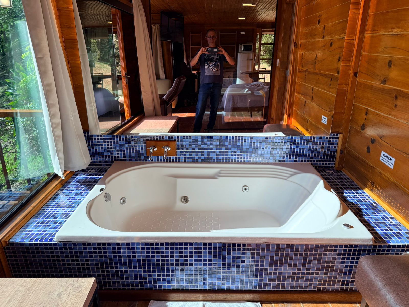 Um dos grandes diferenciais é a banheira de hidromassagem, posicionada estrategicamente para oferecer uma experiência relaxante com vista para a natureza. Um convite para desacelerar, relaxar e transformar sua estadia em um verdadeiro momento de bem-estar.
