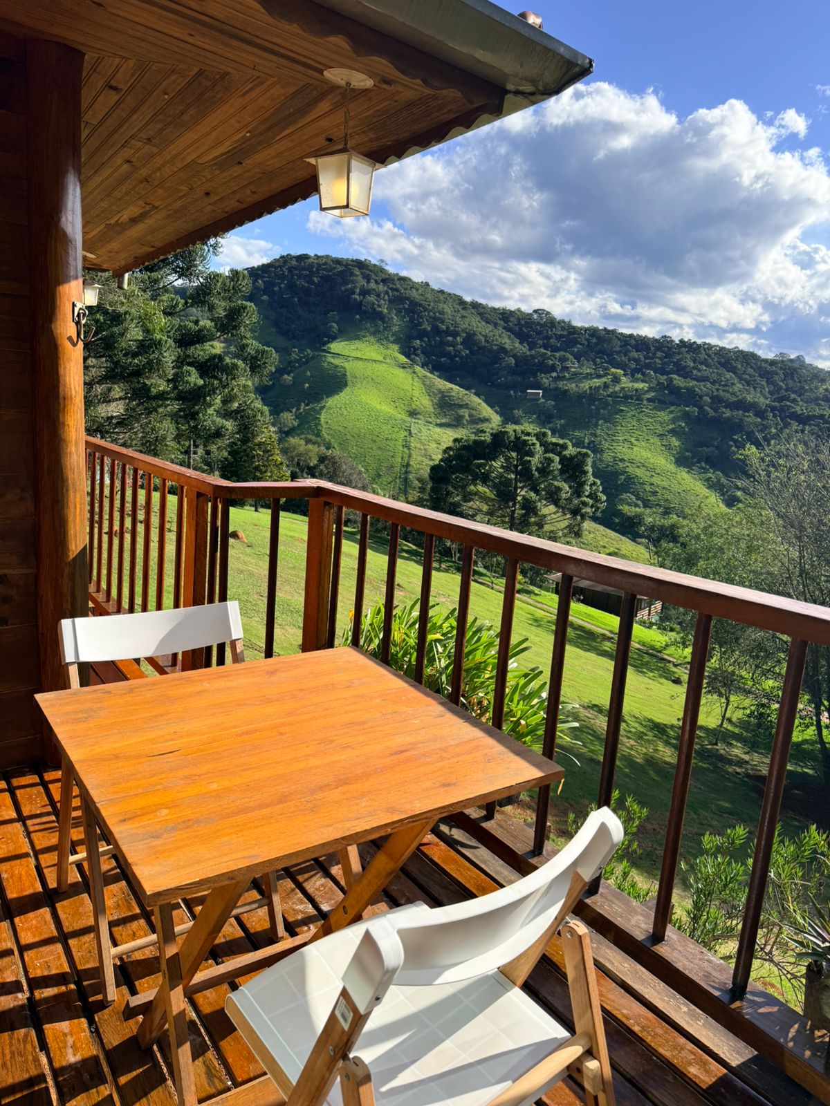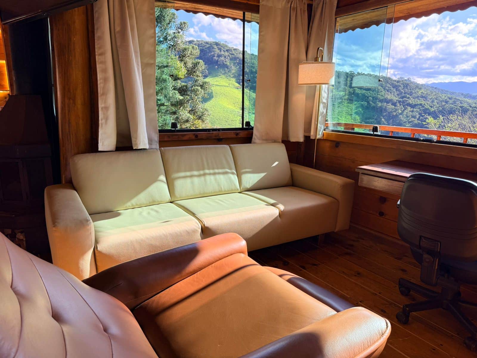 O chalé oferece um ambiente acolhedor e bem distribuído, com destaque para a ampla varanda e grandes janelas que integram o interior à paisagem natural. A sala conta com sofá confortável e um espaço perfeito para relaxar apreciando a vista das montanhas, seja durante o dia ensolarado ou no pôr do sol.